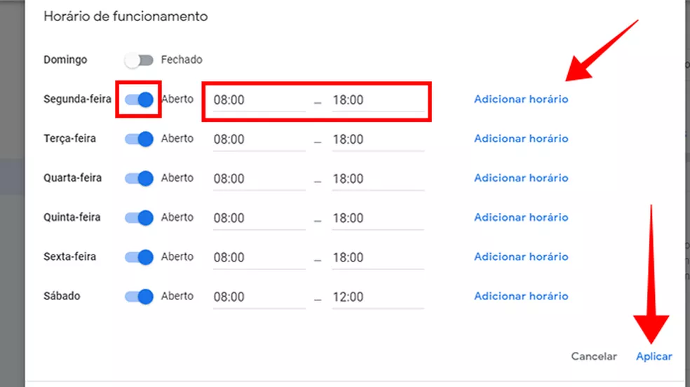 Logo em seguida, é necessário adicionar o dia e horário de funcionamento do seu escritório. Portanto, selecione todos os dias da semana quem que o escritório recebe clientes, defina os horários de abertura e fechamento.